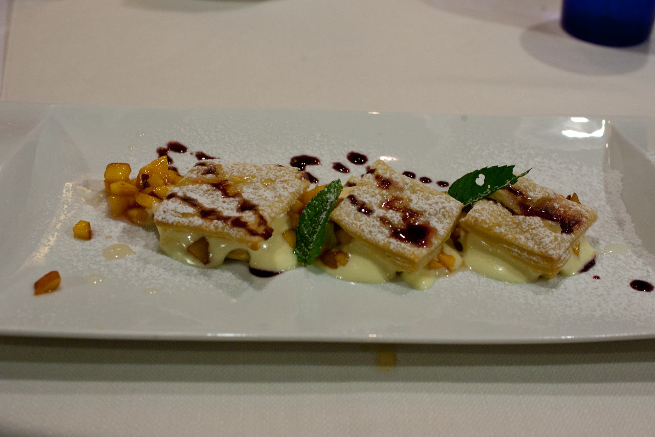 Millefgoglie di pesche con crema ai fiori di sambuco