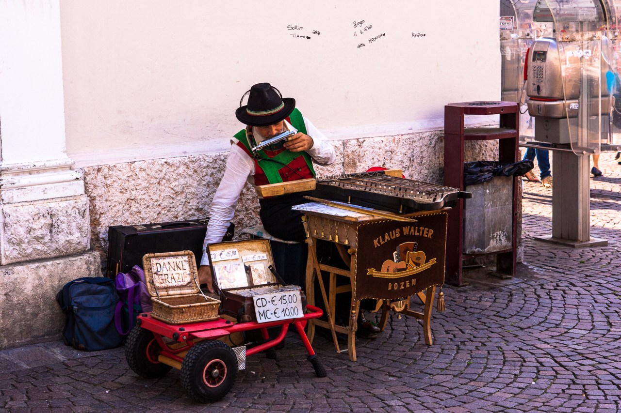 チロルの民族衣装に身を包んだ人が,街角で音楽を奏でています。