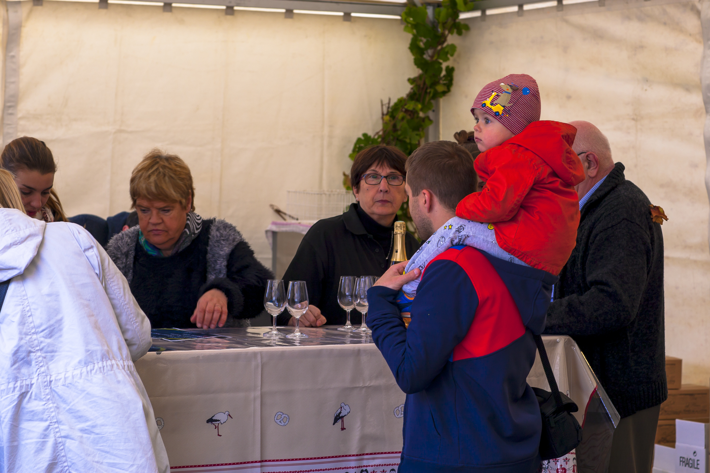 子供を頭で担ぎながら、ワインの試飲。子供は、こうやって色んなワインに触れていくんでしょうね。